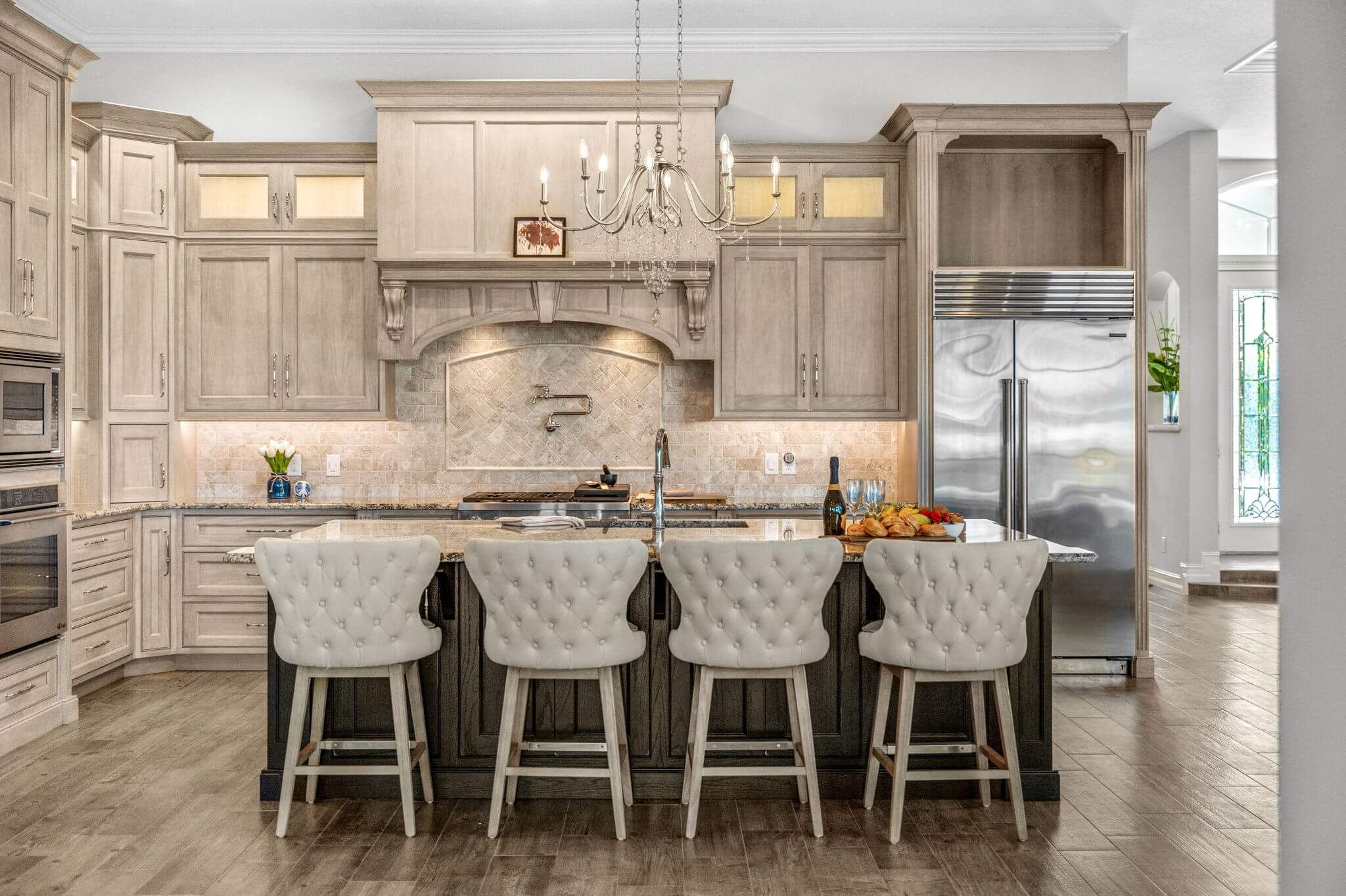 Designed with an open layout, the home seamlessly integrates indoor and outdoor living, allowing you to fully appreciate the breathtaking views of the pool, lanai, and tranquil waterfront. Upon entering, you are greeted by an impressive coffered ceiling that serves as a sophisticated focal point, complemented by graceful arched windows with custom wood casings. Built-in niches and a beautiful fireplace add to the home’s refined atmosphere, while multiple sets of French doors provide easy access to the expansive lanai, summer kitchen, and sparkling pool—ideal for entertaining or relaxing in style.